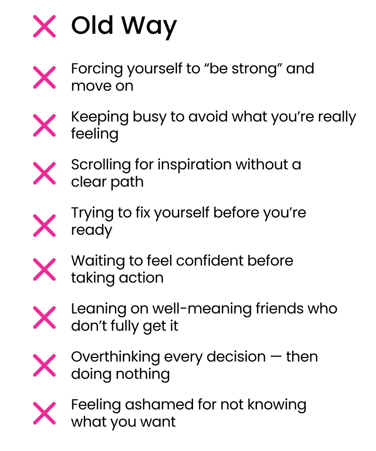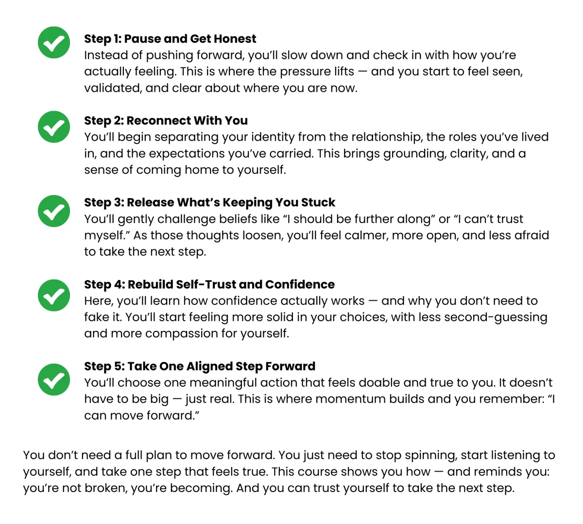 This isn’t a crash course in “moving on” — it’s a soft landing for women who need space to feel, process, and move forward without pressure or pretending.