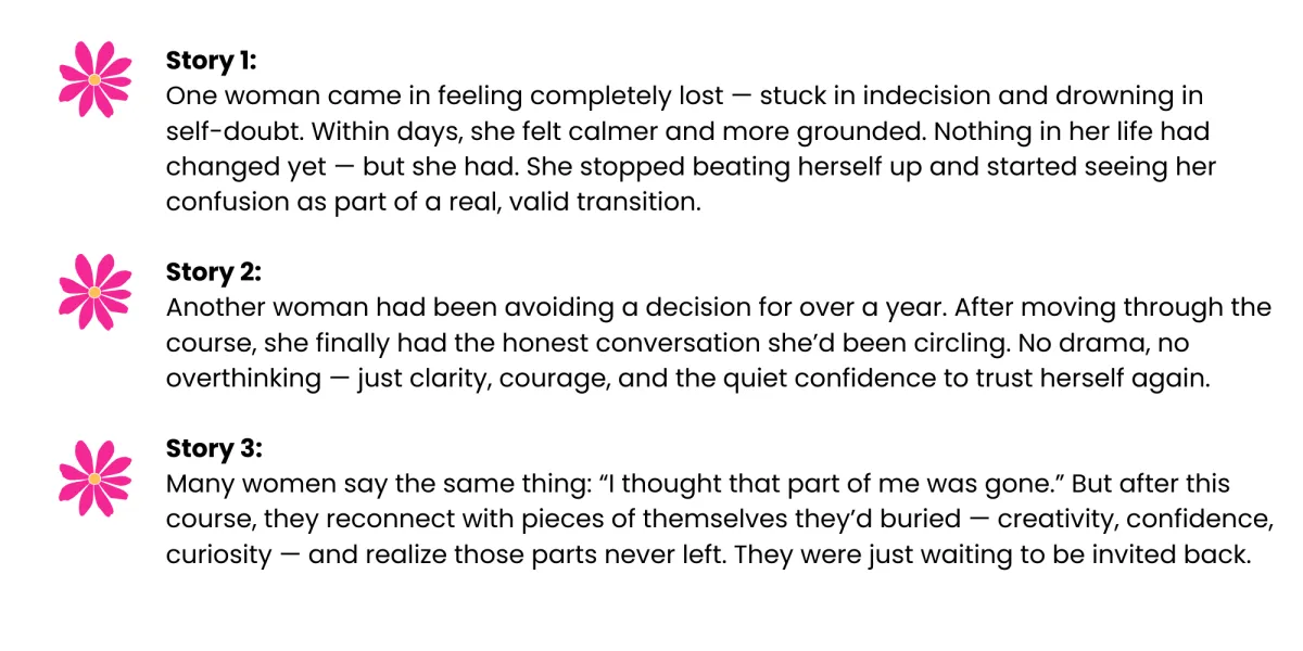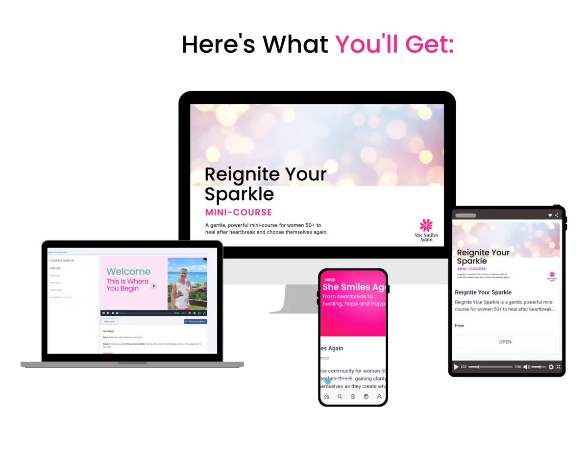 You’ll get immediate access to a guided video course, reflection prompts, and a bonus video from my $5,000 coaching program (unlocked when you complete the course within 5 days) — plus lifetime access to the She Smiles Again community for ongoing support.